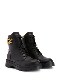 Harlock Zali combat boots Harlock Zali combat boots from Giuseppe Zanotti featuring black, leather, gold-tone logo plaque, round toe, front lace-up fastening, logo-embossed tongue, side zip fastening, ankle-length and ridged rubber sole. Made in Italy Composition Outer: Leather 100% Lining: Leather 100% Inner: Leather 100% Sole: Rubber 100% SIZE & FIT Measurement HEEL 1.77 in(4.5 cm)