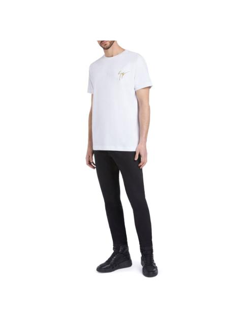 Product Details Crew-neck T-shirt in cotton with embroidered Signature detail. - Black cotton - Signature ORIGIN: ITALY COLOR: BLACK