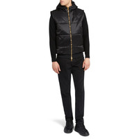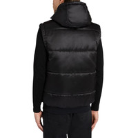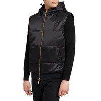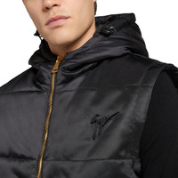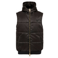 Product Details Sleeveless quilted jacket crafted from black nylon, featuring golden zippers with matching pullers, elastic waistband and hoodie drawstring with golden hardware. A black rubberised 'Signature' detail finishes the garment. Black nylon (100% PA) Black rubberised 'Signature' detail Golden zippers and pullers with logo Black hoodie hardware Made in Italy
