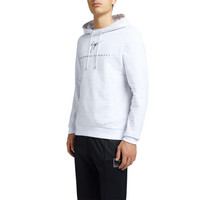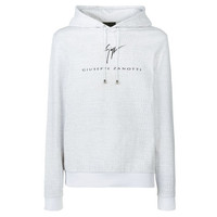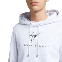 Product Details Hoodie crafted from pure white unbrushed cotton, featuring elastic cuffs and waistband and embellished on the front with an all-over grey ‘Giuseppe Zanotti’ digital print and a black logo print. White unbrushed cotton fleece (100% CO) All-over grey 'Giuseppe Zanotti' digital print Black logo print Made in Italy