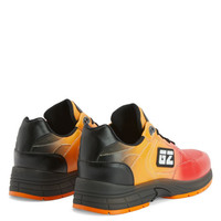 Product Details Low-top sneakers, crafted from faux mixed leather and synthetic mesh fabric with a gradient red print, featuring a black-and-white rubber ‘GZ’ side detail, white ‘Signature’ stitching on the tongues and black eyelets with a matte finish; the transparent TPU soles with orange treads, detailed by shark fin-shaped elements, complete the high-tech design of these running-inspired shoes. Gradient red print on mixed faux leather (58% PU; 42% PA) and gradient red print on netting mixed mesh (100% PL) Black rubber 'GZ' detail with white logo Black rubber eyelet with a matte finish White 'Signature' stitching on the tongue Black transparent TPU sole and orange tread Made in Italy