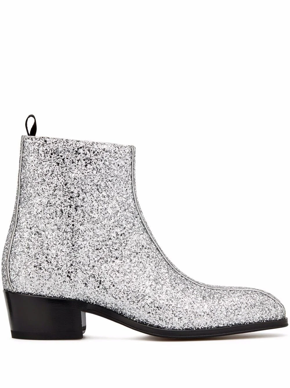 New York glitter ankle boots silver/black leather glitter detailing almond toe side zip fastening ankle-length flat rubber sole low block heel Made in Italy Composition Outer: Glitter 100% Lining: Leather 100% Sole: Leather 100% SIZE & FIT Measurement HEEL 1.57 in(4 cm)
