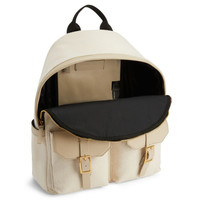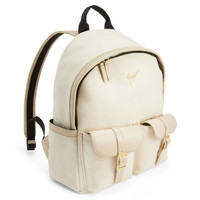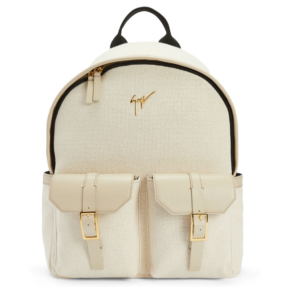 Product Details Backpack crafted from off-white cotton and leather with black fabric inner lining, featuring maxi front pockets, a two-way zipper fastening with matching pullers and the adjustable padded fabric shoulder straps with leather inserts. The iconic golden metal 'Signature' detail completes the accessory. Off-white woven cotton fabric Golden metal 'Signature' and hardware Two-way zipper closure with off-white leather pullers Adjustable and padded fabric shoulder straps with leather inserts Black fabric inner lining Measurements: 330 mm x 410 mm x 152 mm Made in Italy