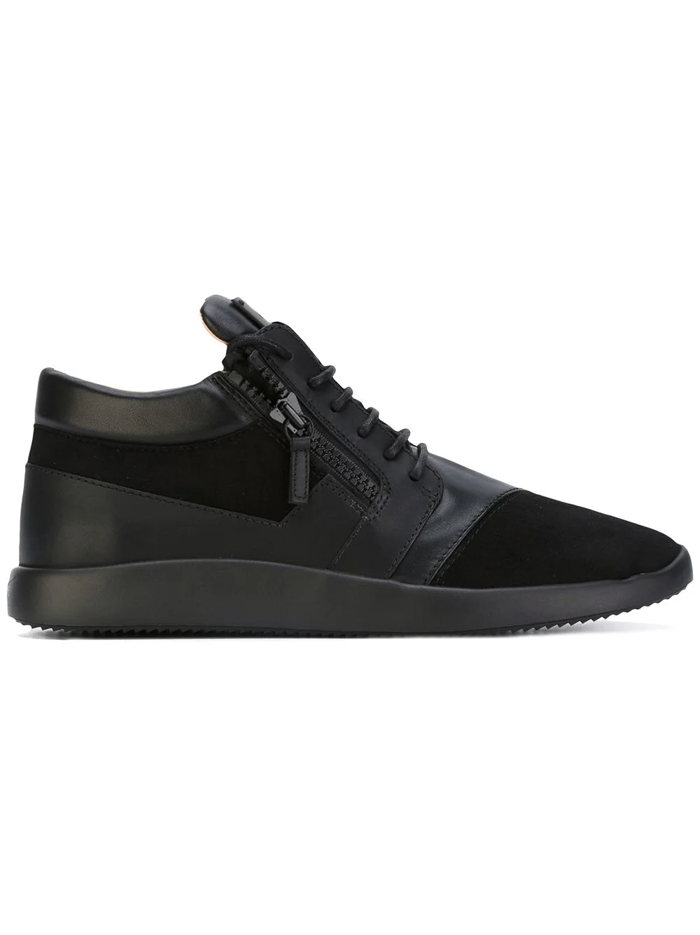 Runner sneakers Giuseppe Zanotti presents its classic 'Runner' sneakers in a sleek all-black design. Crafted from suede and leather, this pair is detailed with silver-tone zip embellishments at the sides. It also features a padded ankle and a flat rubber soles. Made in Italy Composition Outer: Suede 100%, Leather 100% Sole: Rubber 100% Lining: Leather 100% SIZE & FIT Measurement Sole height 0.78 in(2 cm) HEEL 1.18 in(3 cm)