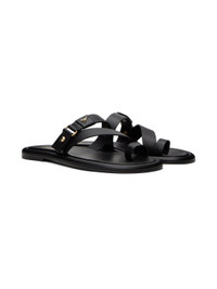 Buffed leather slip-on sandals in black. · Open round toe · Thong-style strap at vamp · Logo hardware at cinch strap · Logo embossed at footbed · Leather sole with rubber injection Supplier color: Nappa vague nero