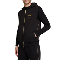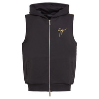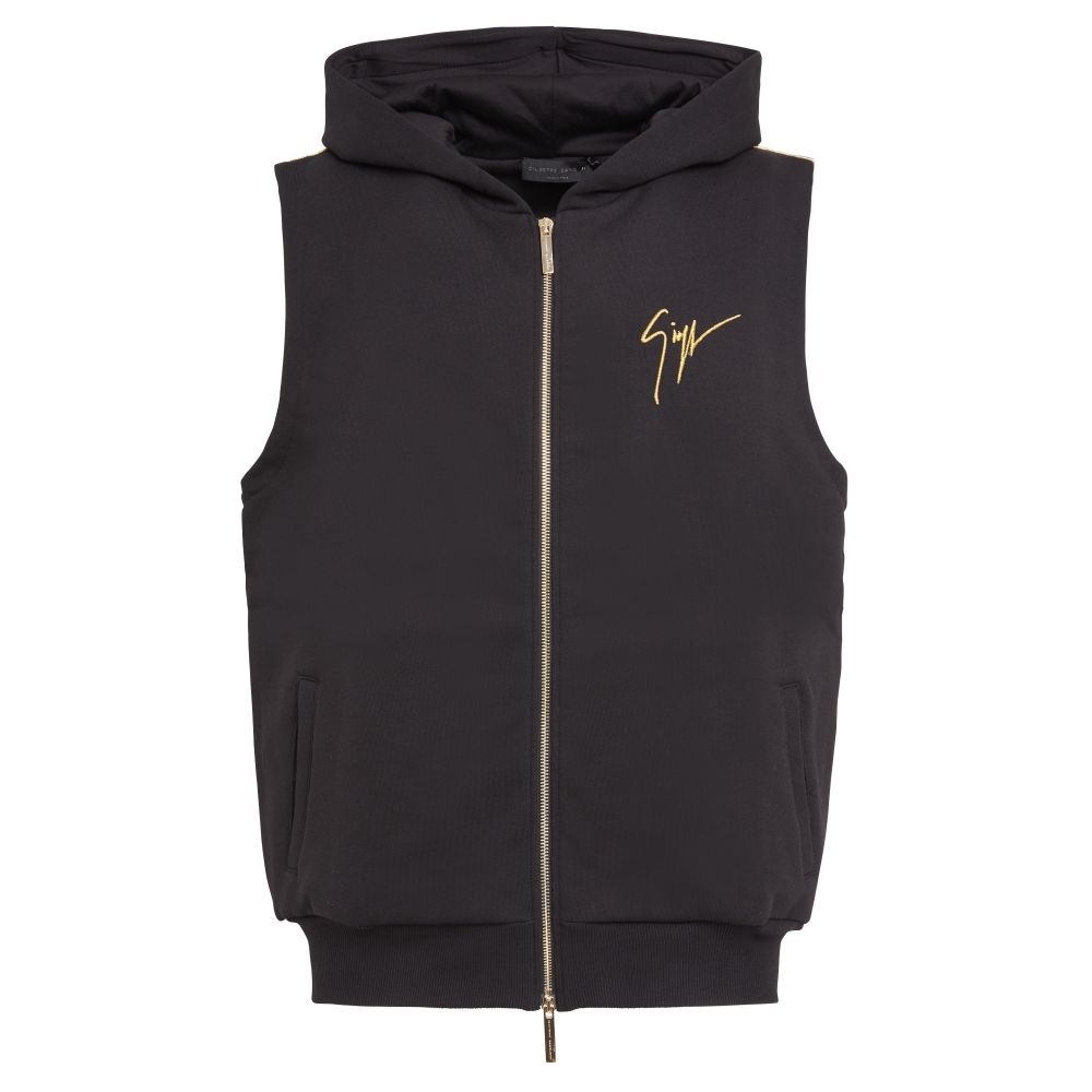 Product Details Sleeveless black cotton hoodie with contrasting golden fabric piping, golden lurex thread-embroidered Signature and metal zip with logo-bearing pull. 100% black cotton Golden fabric piping Golden lurex thread-embroidered Signature Metal zip Made in Italy