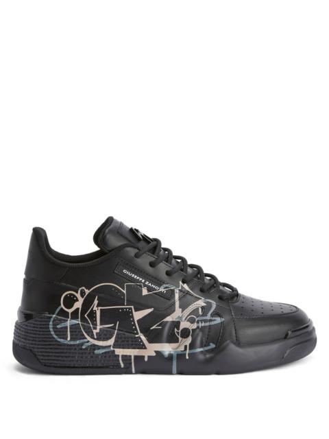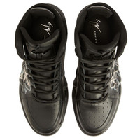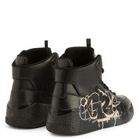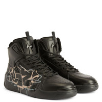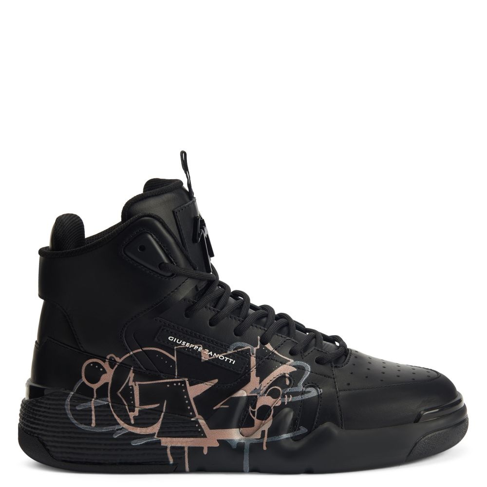 Product Details High-top 'Talon' sneakers crafted from black leather, with matching technical fabric inner lining and cotton laces; the design features a black lacquered metal 'Signature' on the tongue, a matching rubberised 'Label Signature' on the outside, a black, beige and grey 'Graffiti' finish on the upper and a matching rubber sole. Men's sneakers Black leather Black, beige and grey 'Graffiti' finish on the upper Black lacquered metal 'Signature' hardware Black rubberised 'Label Signature' Black rubber sole with logo Made in Italy