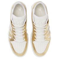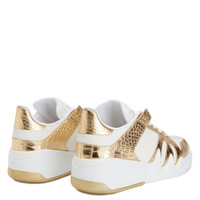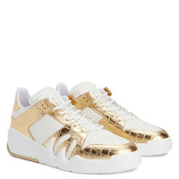 Product Details The ''Talon'' model has been recreated with bold colours that emphasise the urban-street character of this trainer. Made from white leather and laminated-effect golden crocodile-print leather, the upper is embellished with a lacquered white metal Signature. The white rubber sole has a touch of gold on it.' Laminated golden crocodile-print leather and white leather Metal Signature Inner wedge: 2.5 cm Rubber sole with logo Made in Italy