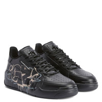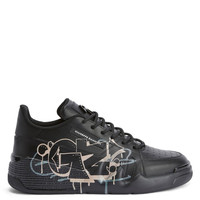 Product Details Mid-top 'Talon' sneakers crafted from black leather, with matching technical fabric inner lining and cotton laces; the design features a black lacquered metal 'Signature' on the tongue, a matching rubberised 'Label Signature' on the outside, a black, beige and grey 'Graffiti' finish on the upper and a matching rubber sole. Men's sneakers Black leather Black, beige and grey 'Graffiti' finish on the upper Black lacquered metal 'Signature' hardware Black rubberised 'Label Signature' White rubber sole with logo Made in Italy