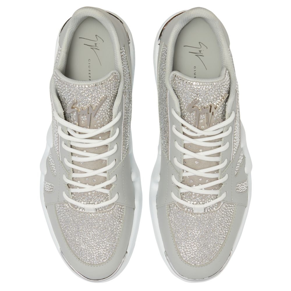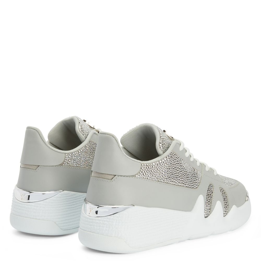 Product Details Low-top 'Talon' sneakers crafted from grey synthetic fabric with a suede effect and leather, with matching technical fabric inner lining and white cotton laces; the design features a crystal-coloured rhinestone embroidery, silver metal 'Signature' hardware on the tongues and white rubber soles with golden spoilers. Grey suede-effect synthetic fabric and leather Silver metal 'Signature' hardware Crystal-coloured rhinestone embroidery Grey technical fabric inner lining White rubber sole with silver chrome spoilers and logo