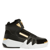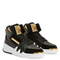 Product Details High-top 'Talon' sneakers crafted from black leather and velour with matching synthetic mesh fabric, black matching inner lining and cotton laces; the design features golden metal ‘Signature’ hardware on the tongue, golden metal ‘Label Signature’ hardware on the outer side of the upper, white rubber soles with a touch of gold on them and golden chromed spoilers. Black leather, velour and black synthetic mesh fabric (100% PL) Golden metal 'Signature' hardware Golden metal 'Label Signature' hardware Black technical fabric inner lining Black-and-white rubber sole with golden chromed spoilers and logo Made in Italy
