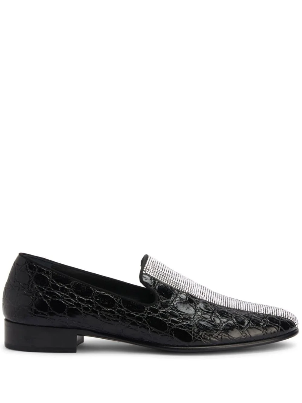 Tuxedo Diamond leather loafers Highlights - Black/silver-tone - Leather - Embossed crocodile effect - Crystal embellishment - Almond toe - Slip-on style - Branded leather insole - Low stacked heel - Leather sole Made in Italy Composition Outer: Leather 100% Sole: Leather 100% Lining: Leather 100%