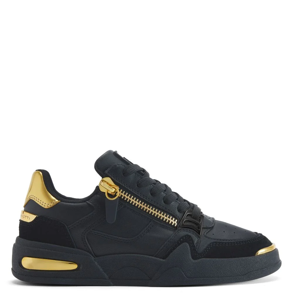 Product Details Low-top lace-up sneakers in leather and suede leather with two side zippers and rubber sole. - Mens sneakers - Black suede leather and leather and golden mirror-finish fabric - Black rubber-topped accessories, lace loop detail and golden heel detail - Black lacing - Gold-colored metal zipper detail - Black rubber sole with golden chrome detailing and logo ORIGIN: ITALY COLOR: BLACK