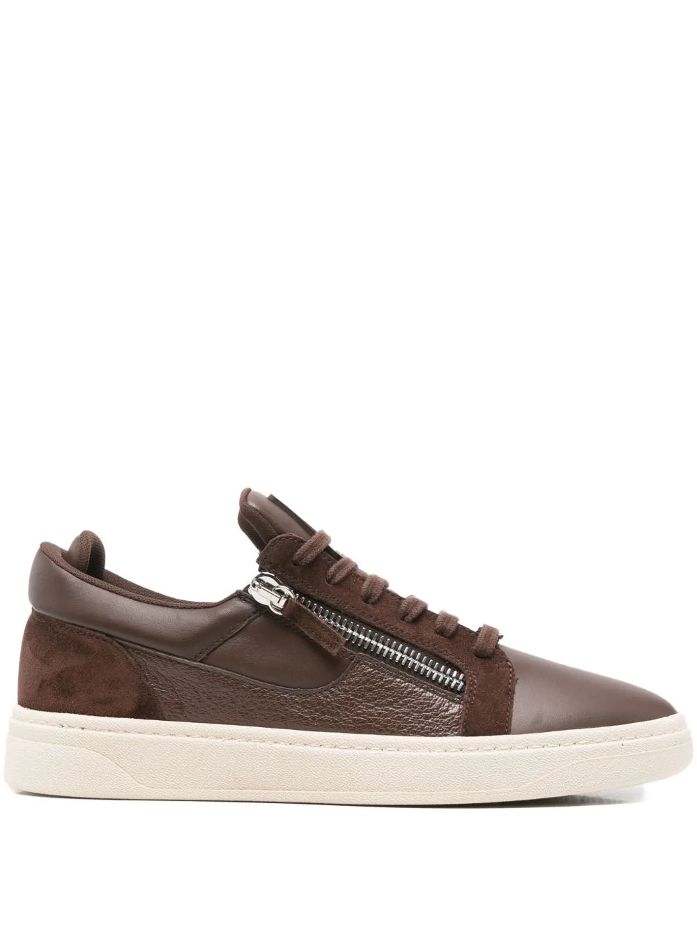 zip-detail sneakers Highlights - Brown - Suede panels - Front zip fastening - Lace-up fastening - Round toe - Flat sole Made in Italy Composition Outer: Calf Suede 100%, Calf Leather 100% Sole: Rubber 100% Lining: Fabric 100%