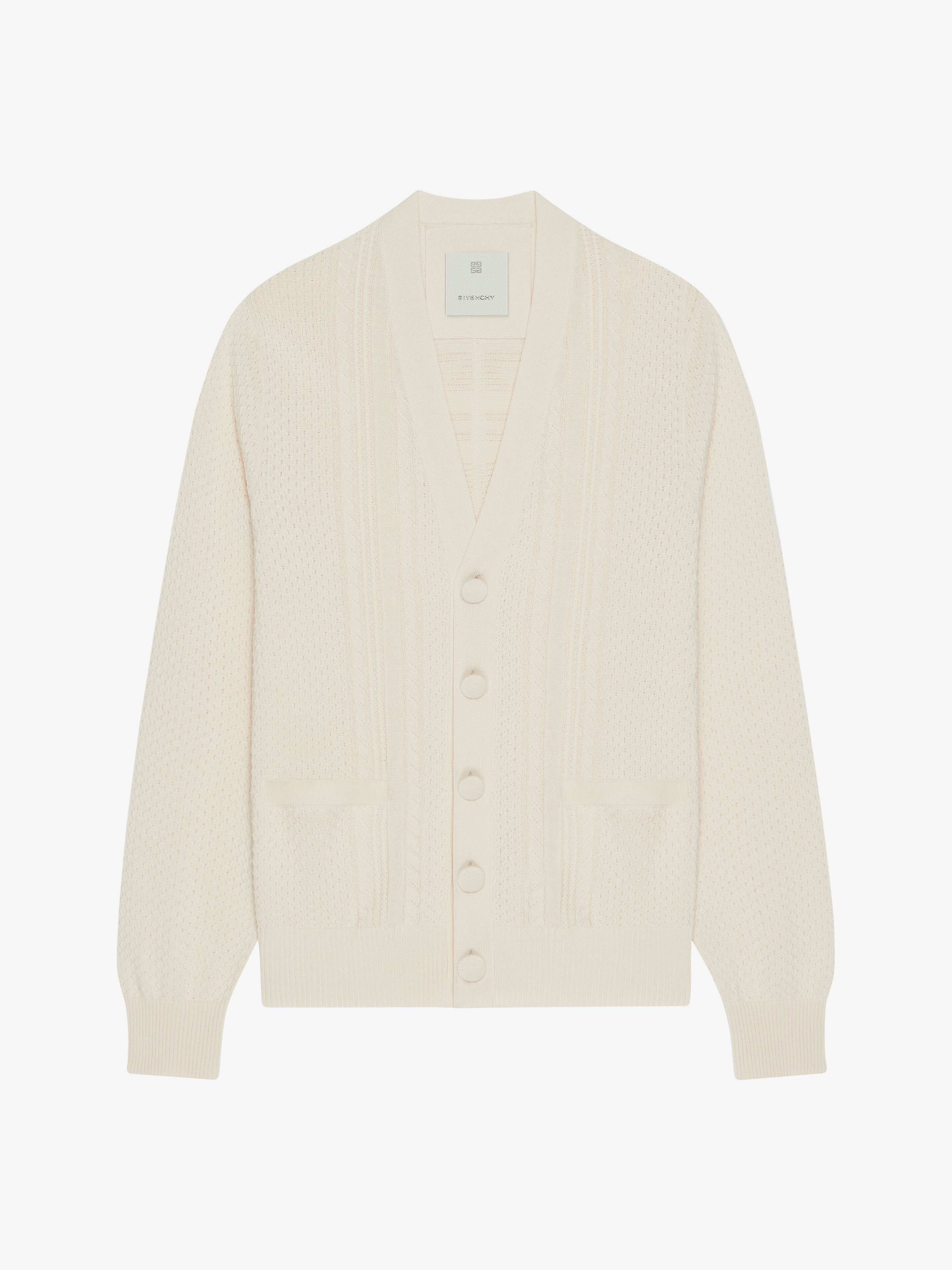 - Long-sleeved cardigan in cable-knit. - V neck. - Raised 4G emblem on the back. - Button closure. - Two front pockets. - Ribbed collar, hem and cuffs. - Model measures 6.1 Feet and wears a size M.