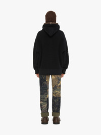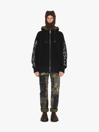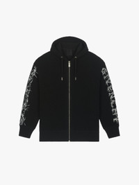 - Hooded sweatshirt in bouclé knit. - Color: black. - Metal zipper closure with GIVENCHY 4G zipper pull. - White barbed wire GIVENCHY signature printed on the left sleeve. - White barbed wire motif printed on the right sleeve. - Hem and cuffs in ribbed knit. - Drawstring with GIVENCHY metal ends on the hood.