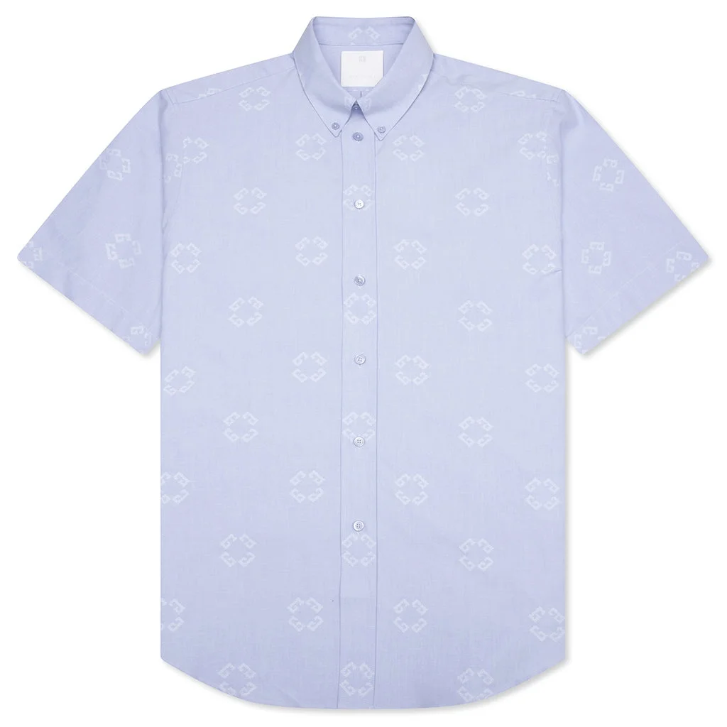The Monogram 72 Jacquard Shirt from GIVENCHY is crafted from 100% premium cotton. The luxurious jacquard weave subtly features the signature Monogram 72 motif across the fabric, creating a tonal and textured look. Designed with a button-down collar, a clean front button closure with mother-of-pearl buttons, and a relaxed, classic cut that drapes elegantly. - 100% Cotton - Classic fit - Monogram 72 jacquard - Button-down collar - Front button closure - Mother-of-pearl buttons - Curved hem - Made in Portugal - Style No: BM611C15U7-453