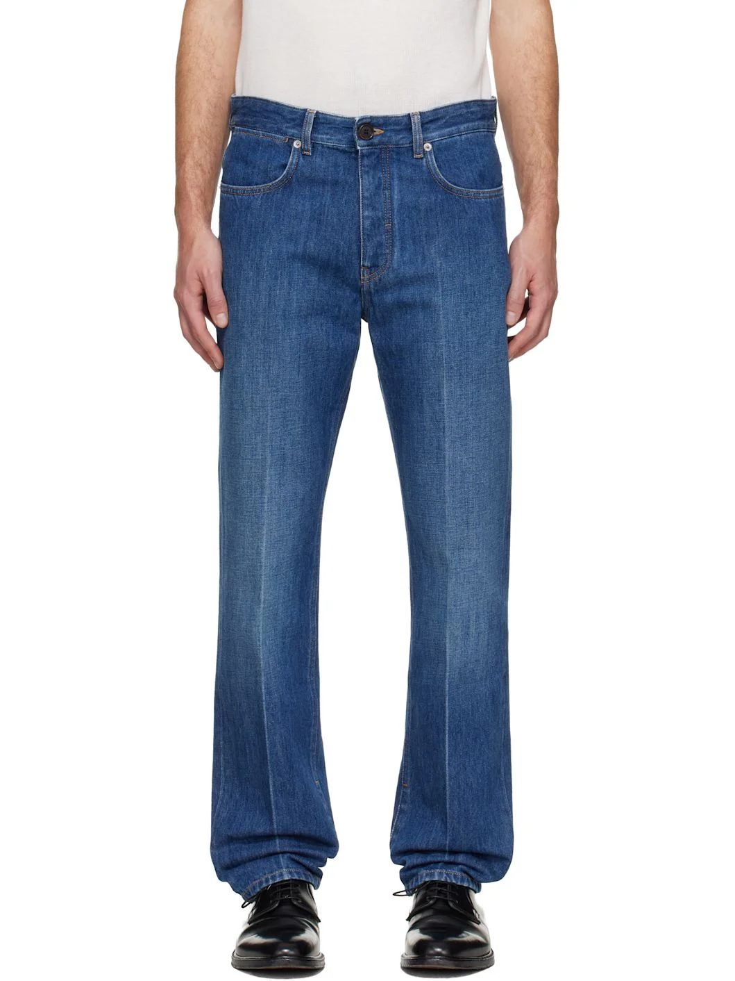 Non-stretch denim jeans. · Fading throughout · Straight-leg · Belt loops · Five-pocket styling · Button fly · Creased legs · Logo patch at back waistband · Logo-engraved silver-tone hardware · Contrast stitching in tan Supplier color: Medium blue 100% cotton. Made in Italy 261278M186005