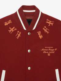 - Wool blend bomber jacket. - Colors: burgundy and red. - Josh Smith X GIVENCHY collaboration. - Fastens with GIVENCHY metal press studs. - Sleeves in embossed leather with 4G motif and a multicolored Devil print. - Devil motif and orange Adresse GIVENCHY embroidered on the front. - GIVENCHY signature suede patch on the back. - Collar, cuffs and hem in burgundy ribbed knit with white stripes. - Two welt pockets in white leather on the sides.