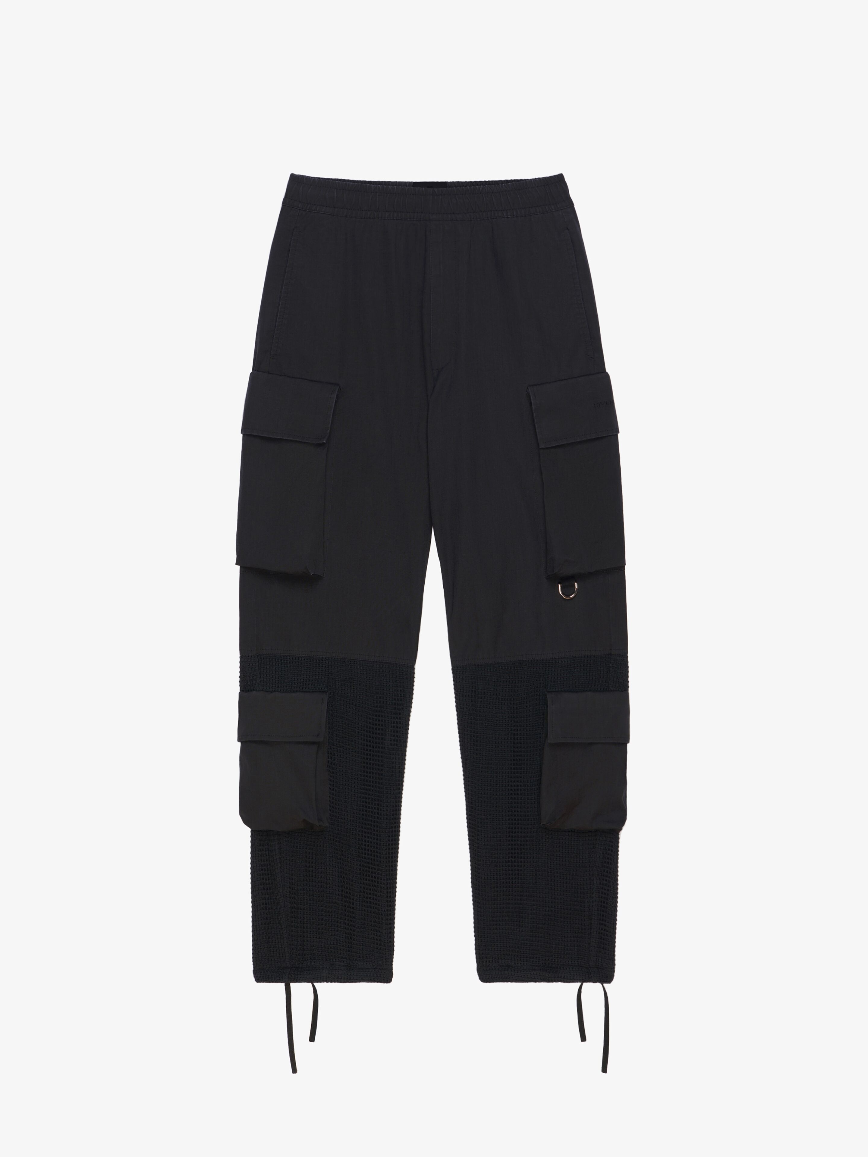 - Wide fit arched cargo pants in ripstop cotton, mesh below the knees. - Elastic waisband. - Two side pockets and two flap pockets, one with D-ring. - Two flap pockets on the back.