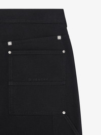 - Carpenter pants in denim. - Patches with studs on the front. - Waist with loops and zipped closure with GIVENCHY metal bar. - Two front pockets. - One carpenter pocket on the side. - Two double pockets and one hidden pocket on the back. - GIVENCHY signature embroidered on the back pocket. - 4G metal rivets on the back. - Carpenter cut. - Model measures 6.1 Feet and wears a size 30.