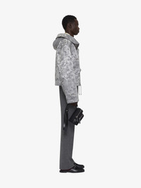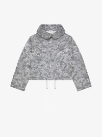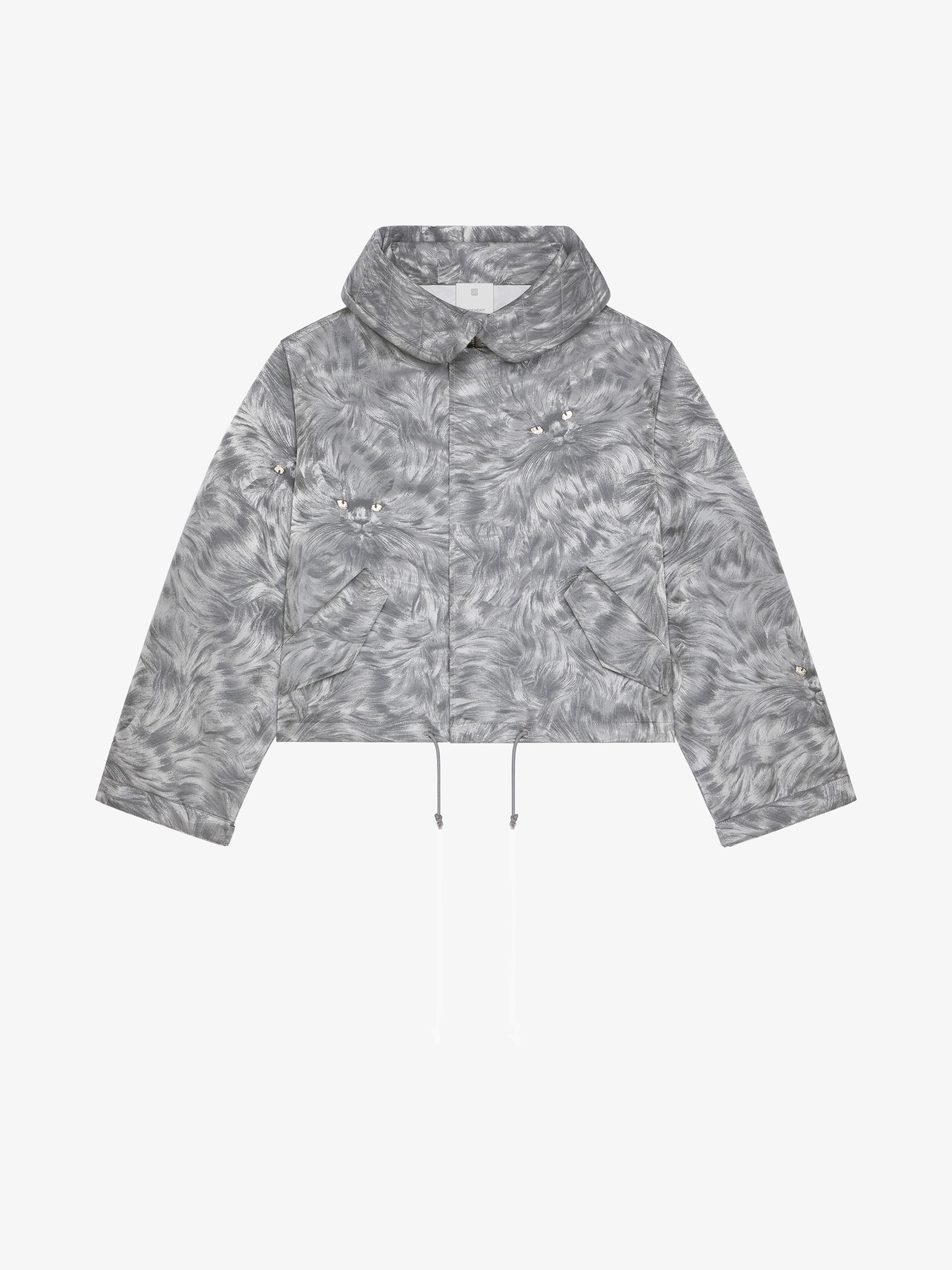 - Short parka in cat jacquard. - Stand up collar with hood. - Zipped closure. - Buttoned cuffs. - Two front flap pockets. - Drawstring on the bottom. - Model measures 6.1 Feet and wears a size 48.