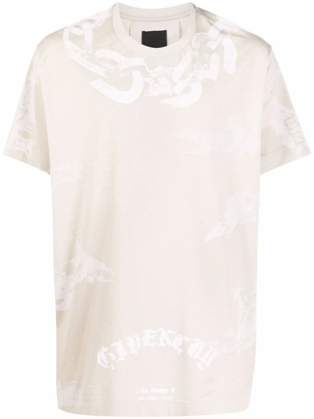 chain-link print logo T-shirt Crafted from soft beige cotton, this short-sleeve T-shirt is detailed with a chain-link print and abstract pattern throughout, aligned with the dystopian spirit of the brand's AW21 collection. A signature Givenchy logo is printed to the front for a recognisable look. Imported Composition Cotton 100% SIZE & FIT Model measurements Height 6 ft 1 in(1.86 m) Bust/Chest 35.43 in(90 cm) Hips 35.43 in(90 cm) Waist 29.92 in(76 cm)