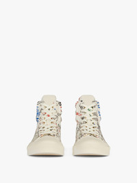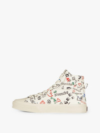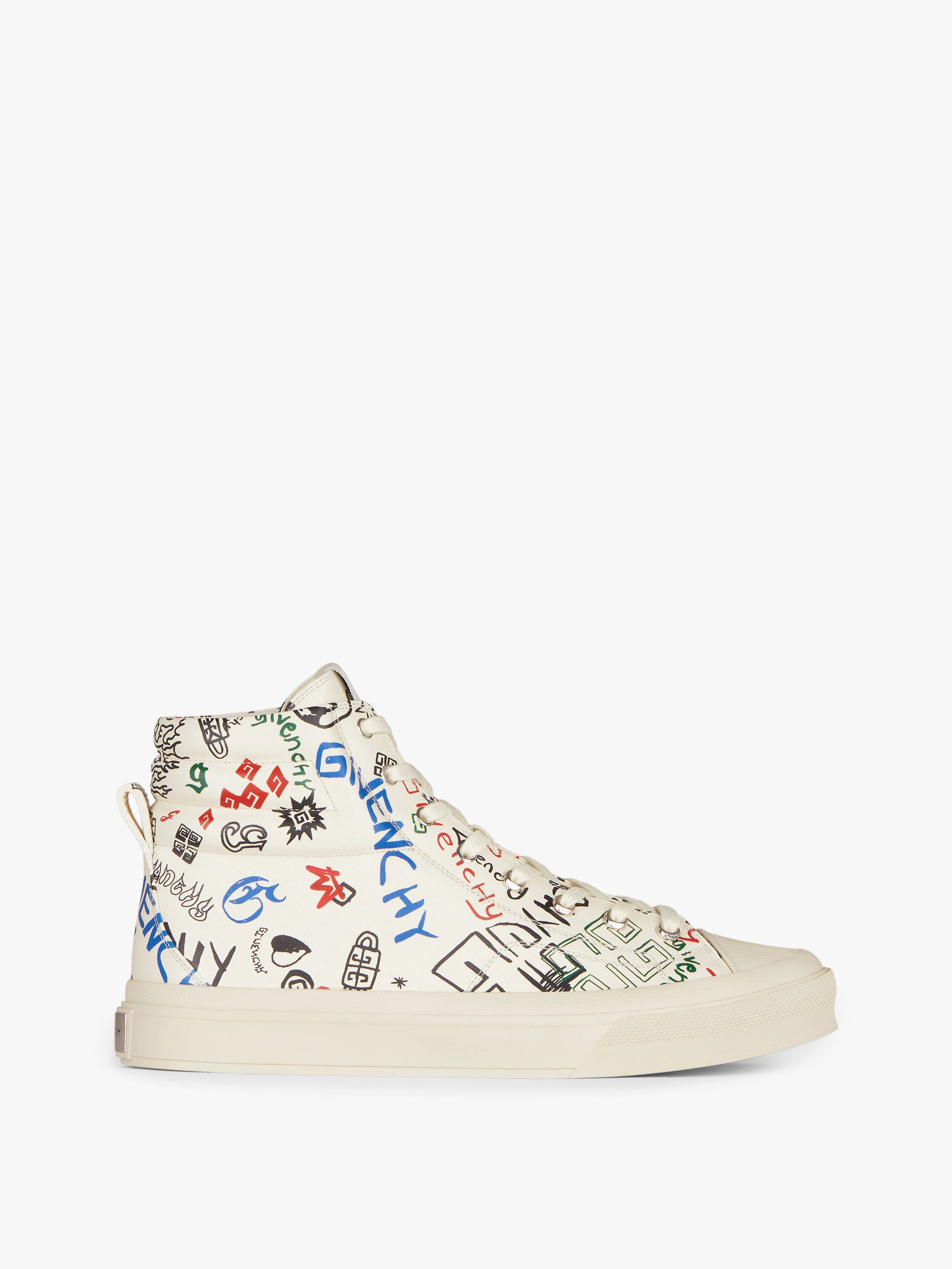 - High-top sneakers in smooth calfskin leather with graffiti print. - City line. - Comfortable quilted reinforcements around the ankle. - GIVENCHY-engraved metal plaque on the heel. - White grained leather label with debossed 4G emblem on the tongue. - Lambskin leather insole with GIVENCHY 4G signature.