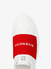 - Sneakers in smooth calfskin leather with GIVENCHY-embroidered textured elastic band. - City Sport line. - Metal 4G emblem on the tongue. - Red leather insert and silver GIVENCHY signature on the back. - Debossed 4G emblem on the heel. - Calfskin leather insole with GIVENCHY 4G signature.