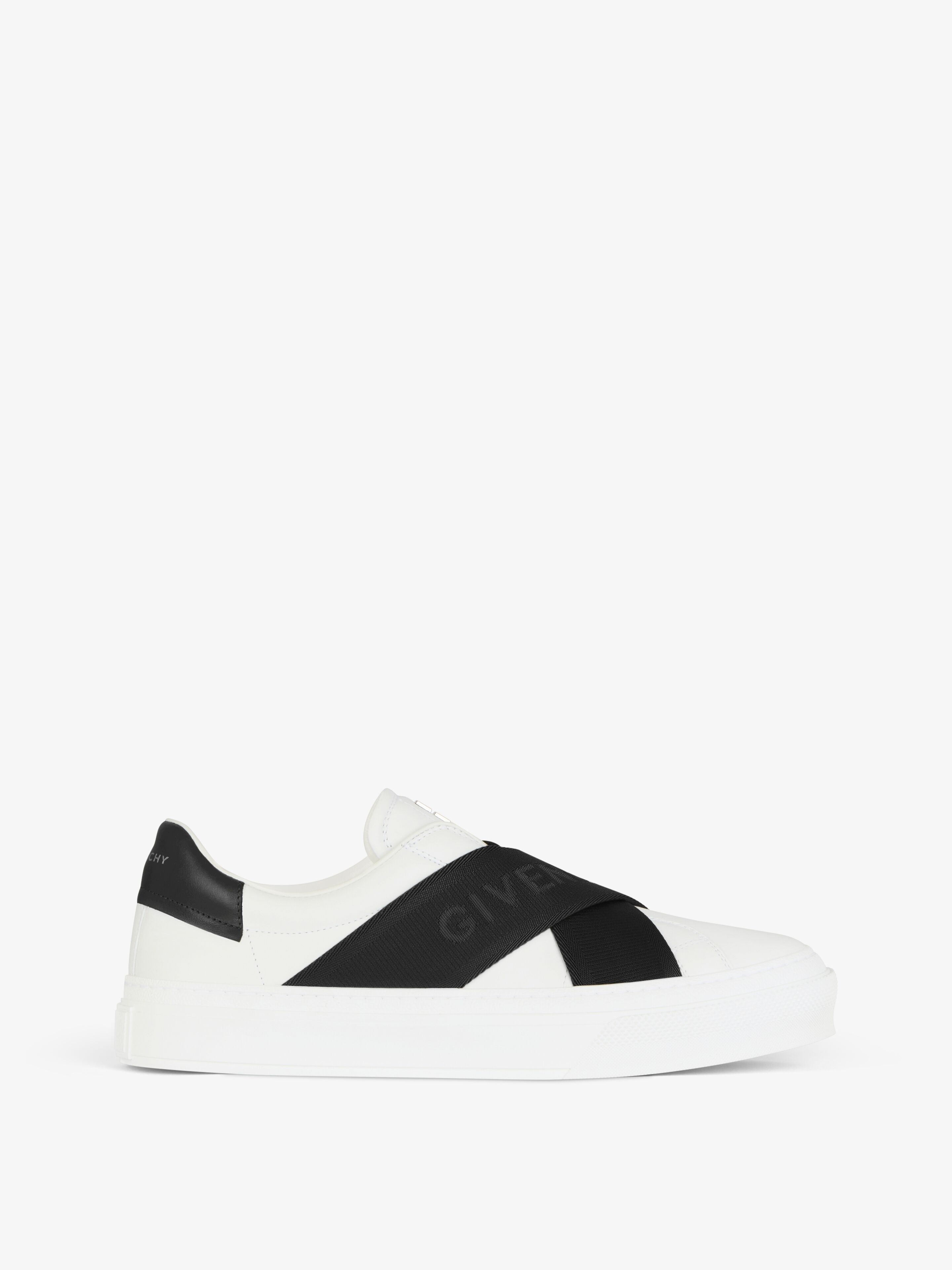 - Sneakers in calfskin leather. - City Sport line. - GIVENCHY webbing bands crossed on top. - Silvery-finish metal 4G piece on the tongue. - 4G emblem embossed on the back of the sole and under the sole. - Leather insert on the back with GIVENCHY signature. - Calfskin leather insole with GIVENCHY 4G signature. - Comfortable.