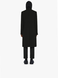 - Long structured coat in textured knit wool. - Color: black. - Notch lapel. - Padlock closure in silver-finish metal. - Two welt pockets on the sides. - Black lining with 4G motif. - Straight-cut.