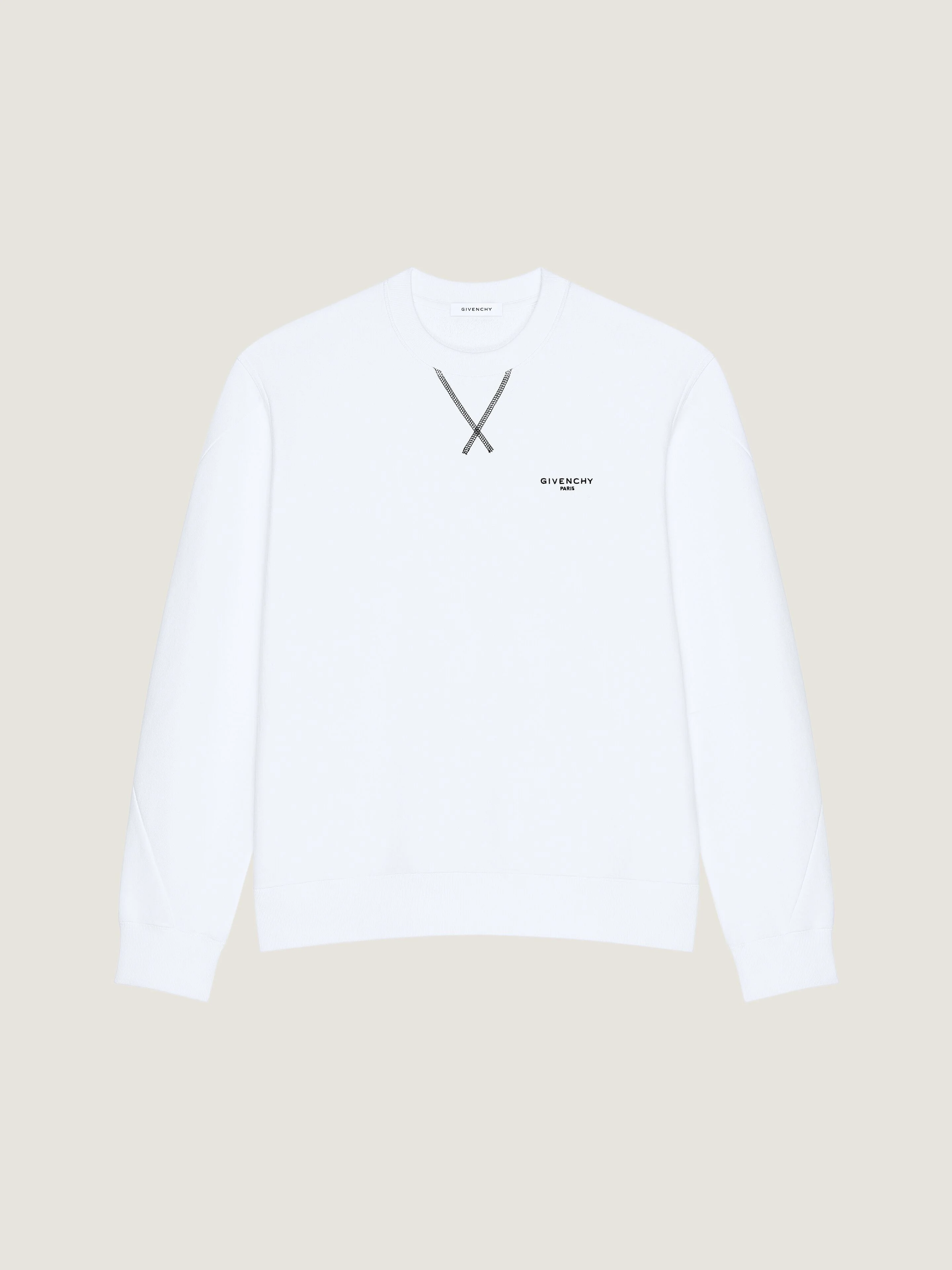 - Long-sleeved sweatshirt in fleece. - Crew neck. - Small GIVENCHY Paris signature embroidered on the chest. - Ribbed collar, hem and cuffs. - Couture seams for a rounded proportion. - Relaxed fit. - Model measures 6.1 Feet and wears a size M.