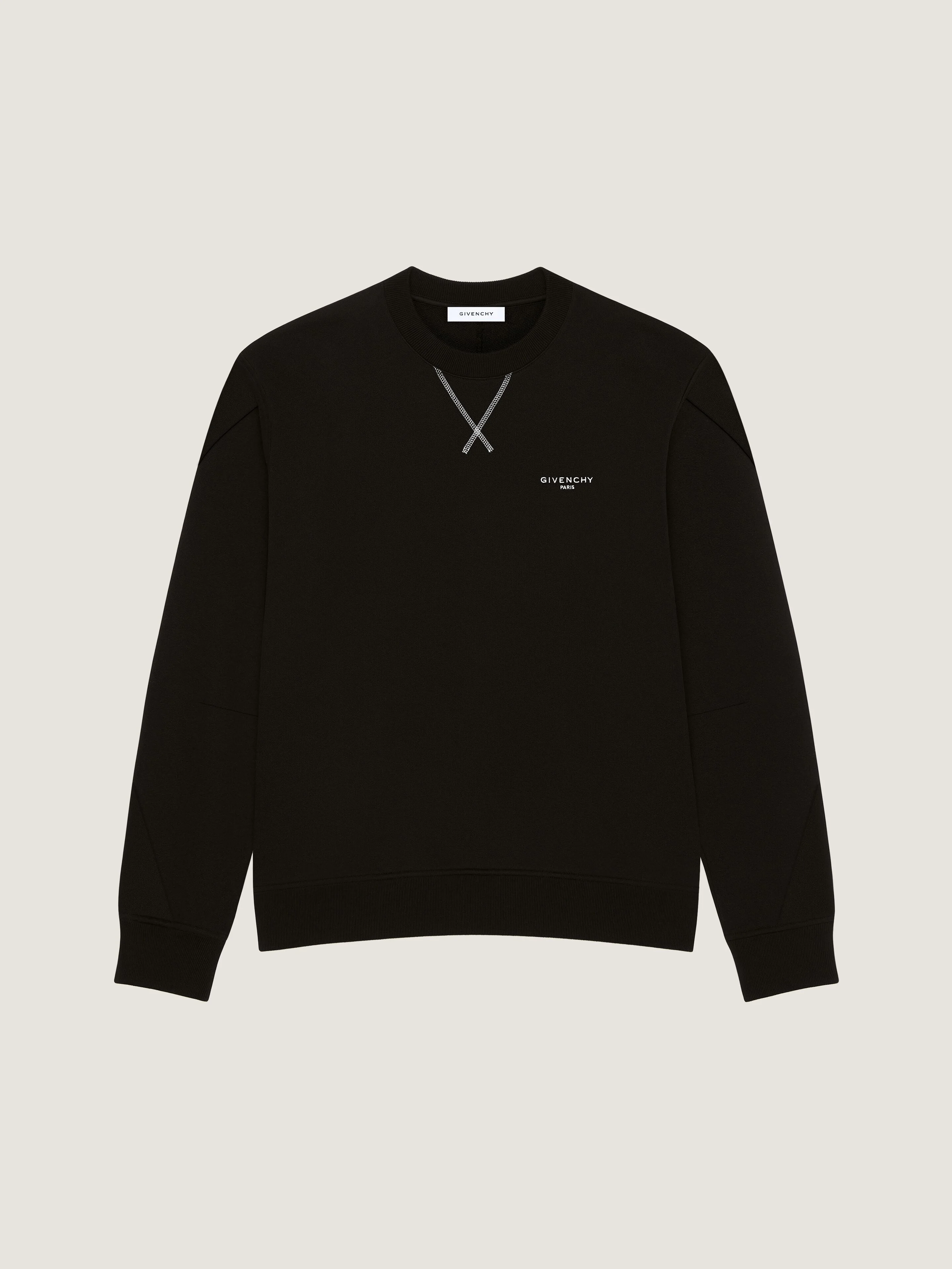 - Long-sleeved sweatshirt in fleece. - Crew neck. - Small GIVENCHY Paris signature embroidered on the chest. - Ribbed collar, hem and cuffs. - Couture seams for a rounded proportion. - Relaxed fit. - Model measures 6.1 Feet and wears a size M.