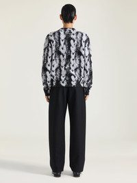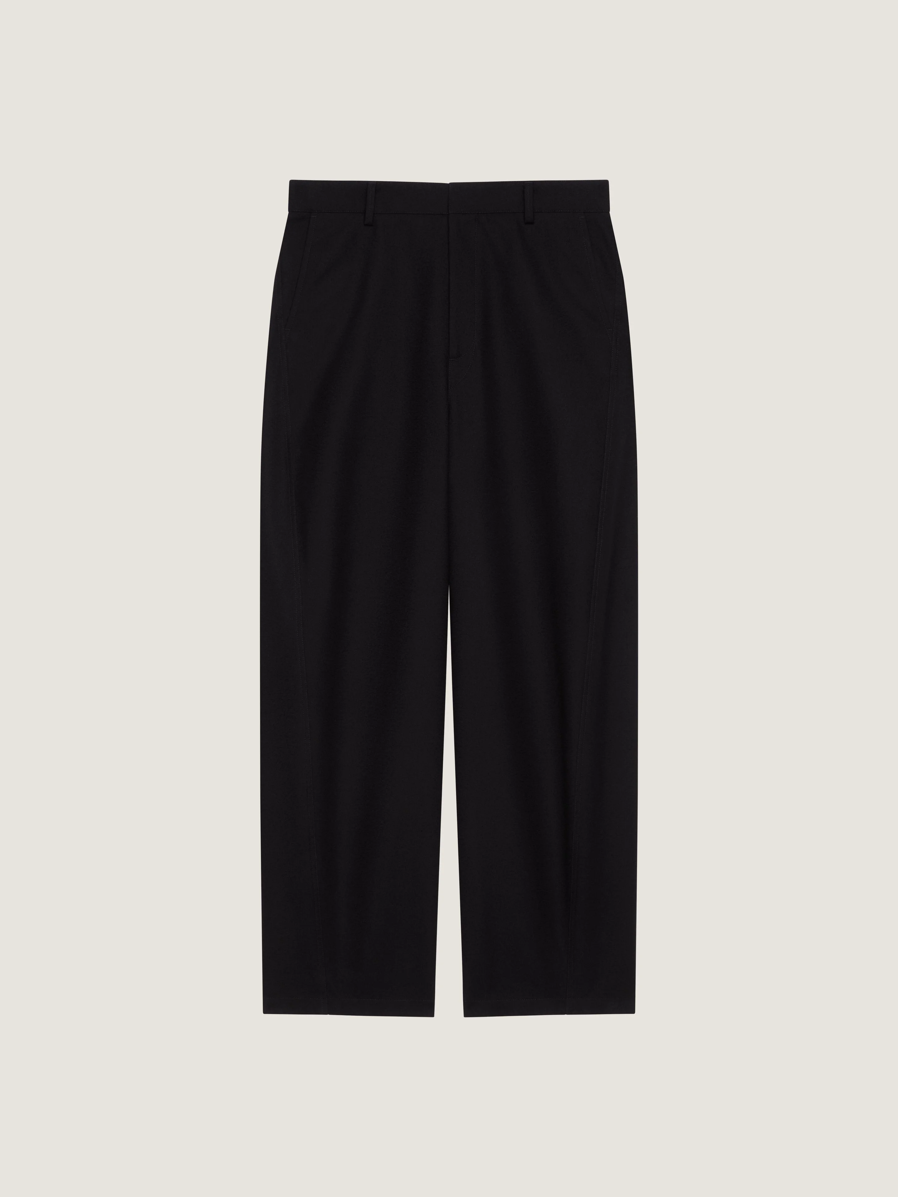 - Tailored pants in wool flannel. - Zipped and button closure. - GIVENCHY leather button on the back. - Two side pockets. - Two back pockets. - Bias seams for a cocooning volume. - Relaxed fit. - Model measures 6.1 Feet and wears a size 48.