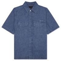 The Logo Embroidered Short-Sleeve Shirt from GIVENCHY is constructed from 100% premium cotton. The relaxed, boxy silhouette features a classic collar, hidden front button closure, and two chest flap pockets for timeless appeal. Embroidered with the GIVENCHY signature logo on the chest, it balances understated branding with polished craftmanship. - 100% Cotton - Mid-weight chambray fabric - Boxy fit - Classic collar - Hidden front button closure - Chest flap pockets with button closure - Embroidered signature logo - Made in Italy - Style No: BM613J5YAP-457