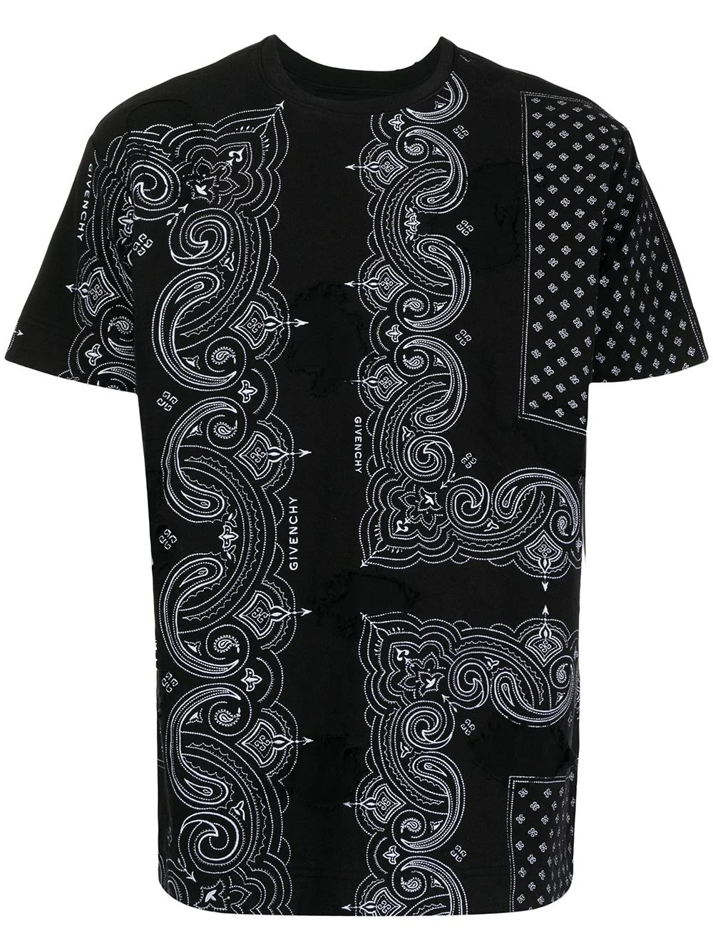 distressed-effect bandana-print T-shirt black cotton blend bandana print signature 4G motif distressed effect crew neck short sleeves straight hem Imported Composition Outer: Polyester 52%, Cotton 48% SIZE & FIT Model measurements Height 6 ft 1 in(1.85 m) Bust/Chest 40.15 in(102 cm) Hips 37.79 in(96 cm) Waist 29.52 in(75 cm) Washing instructions Machine Wash