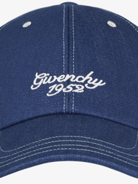 - Cap in denim. - Curved brim. - Embroidered GIVENCHY 1952 signature. - 4G emblem embroidered on the back. - Contrasting stitchings. - Tab with GIVENCHY-engraved metal buckle on the back.