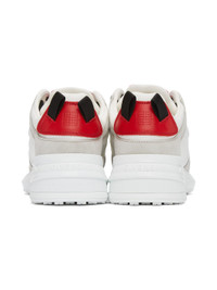 Low-top panelled mesh and leather sneakers in shades of grey, white, and red. · Lace-up front closure in black · Debossed logo on tongue · Padded insole · Leather lining · Pull loop at heel · Logo embossed rubber sole Supplier color: Grey/White/Red Upper: leather, textile. Sole: rubber.
