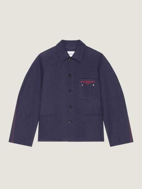 - Jacket in white denim. - Classic collar. - Contrasting GIVENCHY Paris signature embroidered on the chest. - Button closure. - GIVENCHY engraved silvery button on top. - One chest pocket and a small pocket. - Two front pockets. - Contrasting stitchings on the sleeves. - Couture seams. - Model measures 6.1 Feet and wears a size M.