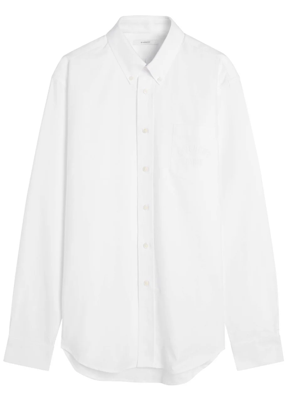 Info & Care Givenchy cotton shirt Button-down collar, button-fastening cuffs, logo embroidery at chest patch pocket, box pleat through back, curved hem Button-fastenings through front 100% cotton Machine wash Size & Fit Length shoulder to hem: 30 inches/ 76cm Midweight Regular fit Model is 6'1"/ 185cm and wears a size C15.5