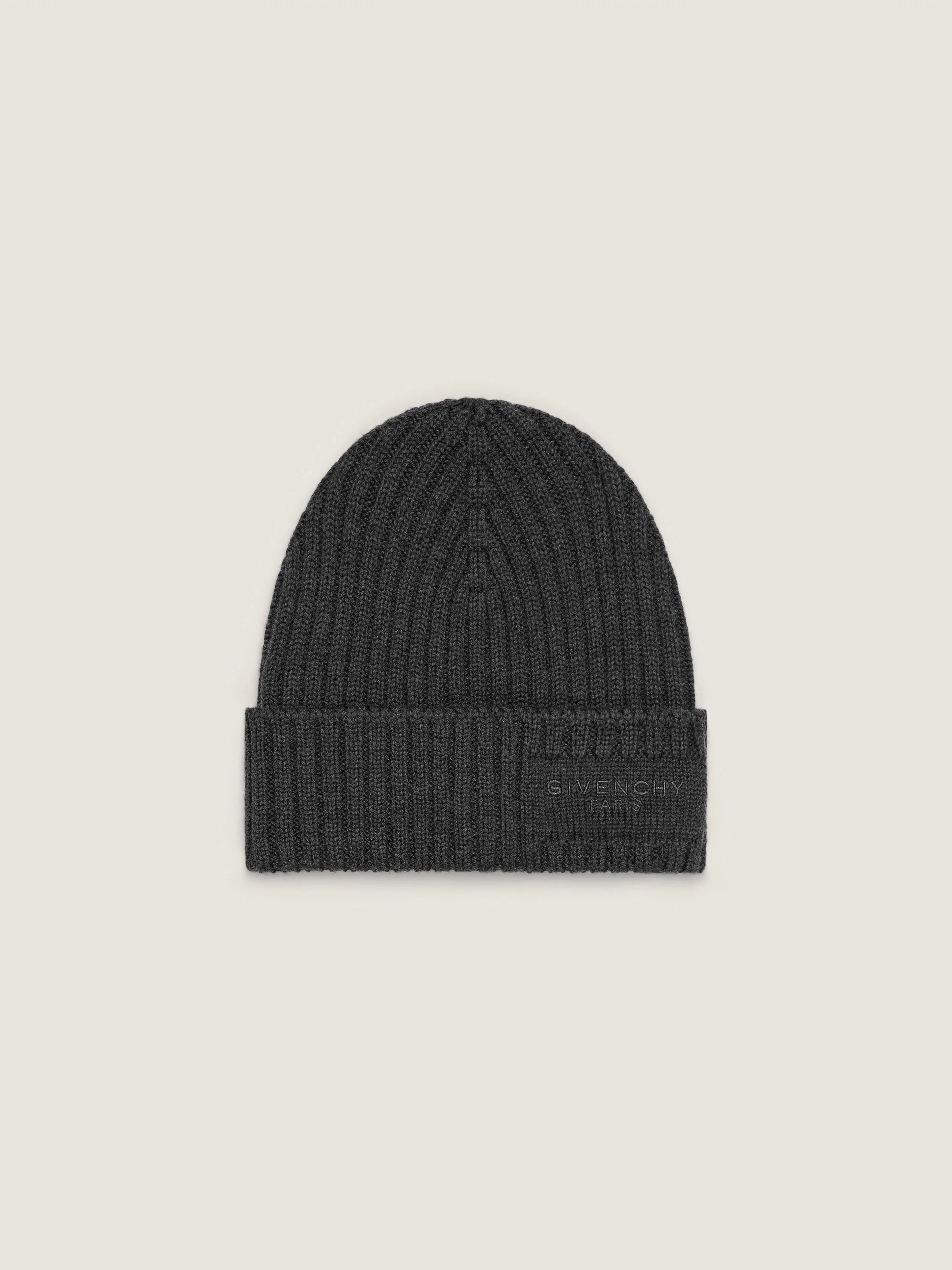 - Beanie in knitted wool. - Tone-on-tone GIVENCHY Paris signature embroidered on the turn-up, on the front. - Matching scarf sold separately.