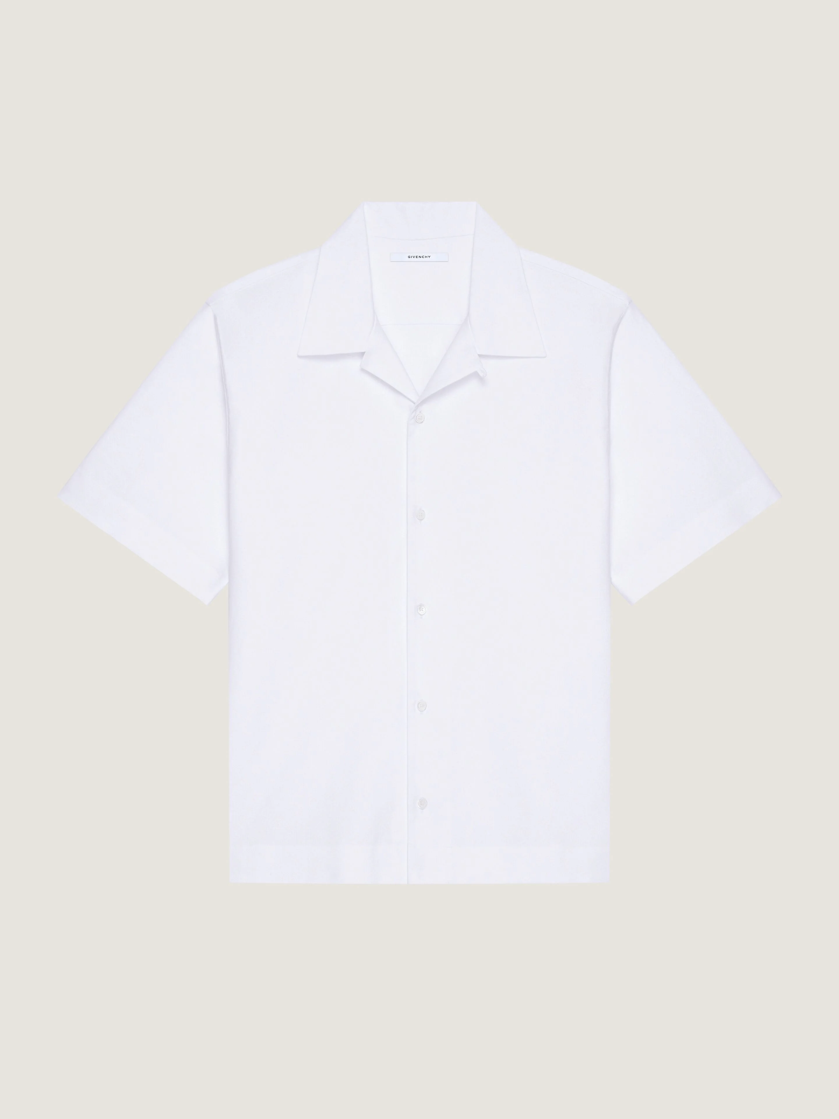 - Short-sleeved shirt in cotton. - Hawaiian collar. - GIVENCHY Paris gros grain patch with zigzag stitchings embroidered on the back. - Button closure. - Relaxed fit.