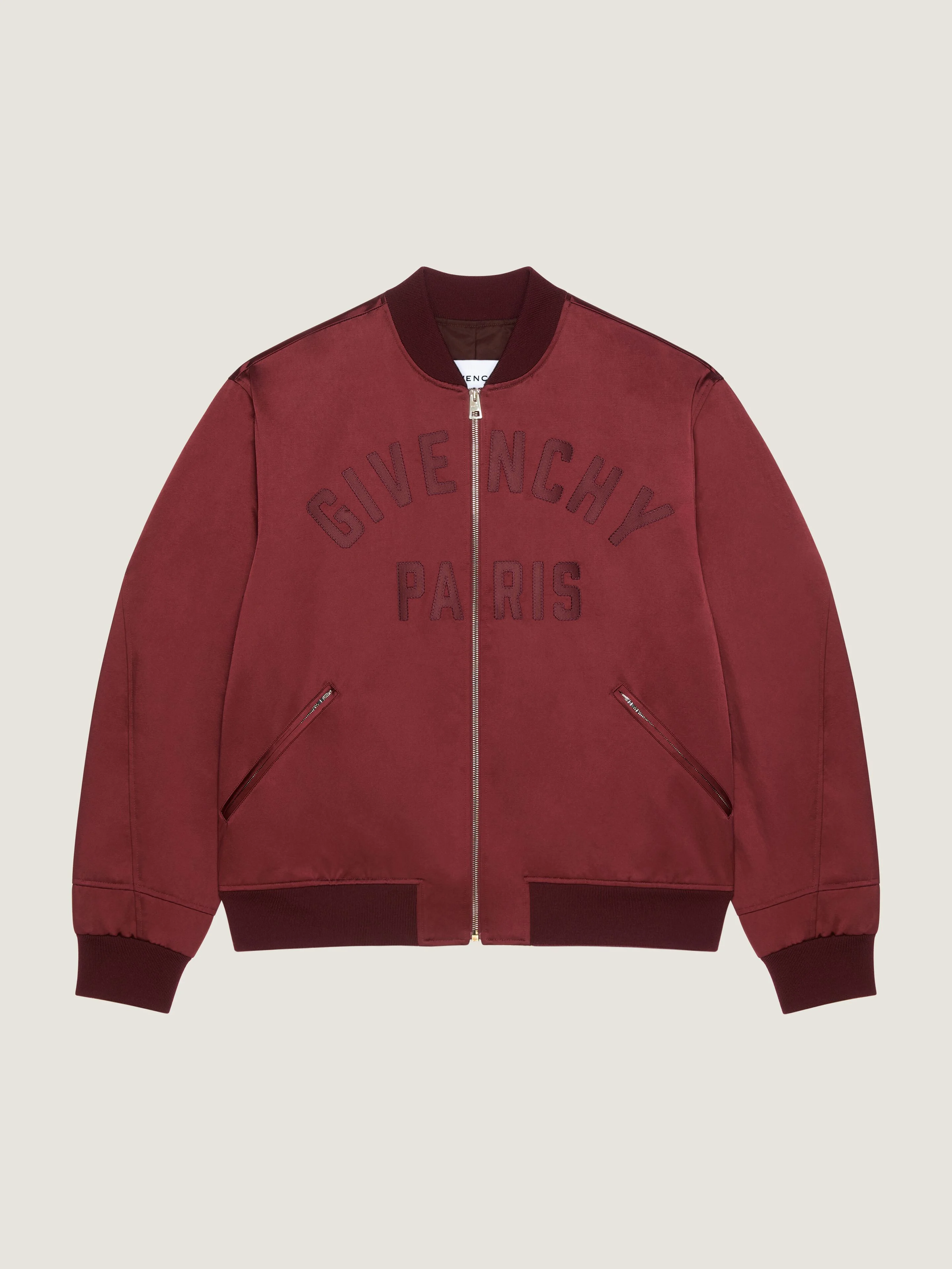 - Blouson in satin and cotton. - Bomber collar. - GIVENCHY Paris gros grain patch with zigzag stitchings embroidered on the front. - Zipped closure. - Two zipped pockets. - Ribbed collar, hem and and cuffs. - Relaxed fit. - Model measures 6.1 Feet and wears a size 48.