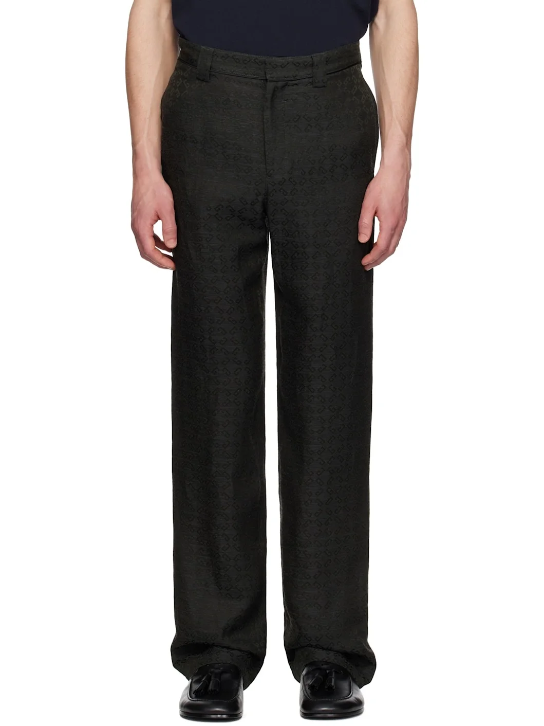 Plain-woven acetate- and linen-blend trousers. Jacquard logo pattern throughout. · Belt loops · Four-pocket styling · Zip fly · Partial cupro satin lining Supplier color: Dark grey Body: 49% acetate, 30% linen, 21% viscose. Lining: 100% cupro. Made in Italy 251278M191007