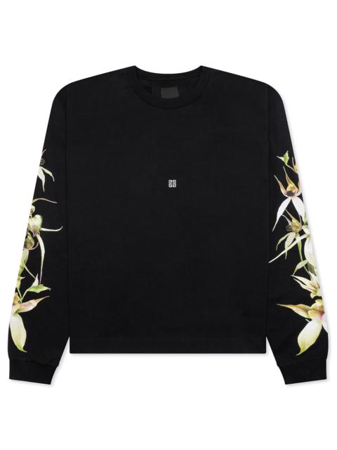 The GVCY Long Sleeve T-Shirt in Black offers a blend of style and comfort. Crafted from 100% cotton, this t-shirt features printed graphics on the sleeves and back with the GVCY design, showcasing Givenchy's signature branding on the front. Perfect for casual wear, it provides a stylish addition to your wardrobe. - 100% cotton - Printed graphics on the sleeves and back with the GVCY design. - Givenchy signature branding on the front. - Style no: BM71KP3YLU-001