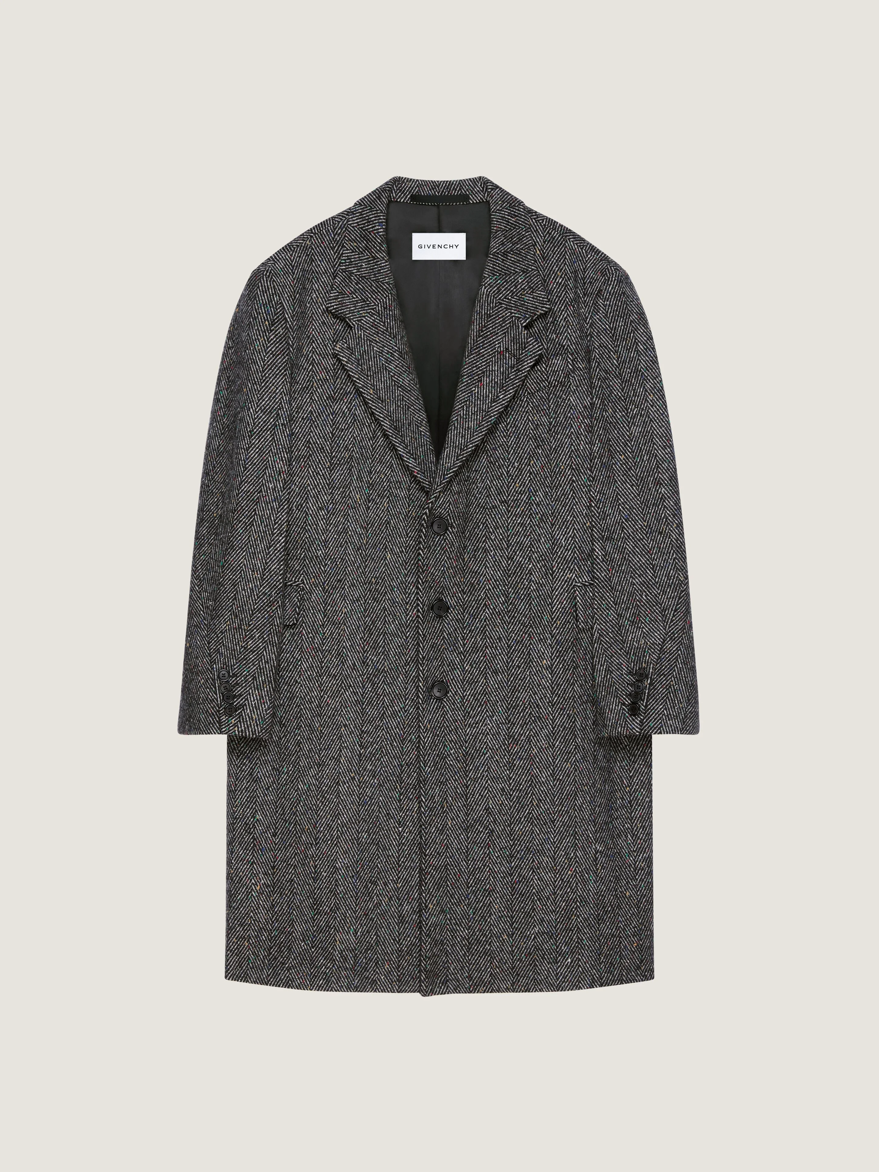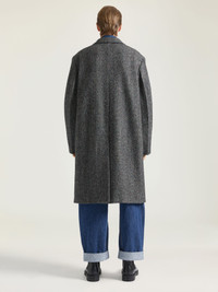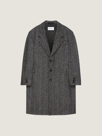 - Coat in wool. - Notch lapel. - Gros grain detail on the neckline, on the inside. - Button closure. - Buttoned cuffs. - One chest pocket. - Two front flap pockets. - Satin lining. - Bias seams for a cocooning volume. - Relaxed fit. - Model measures 6.1 Feet and wears a size 48.