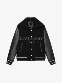 - Hooded varsity jacket in wool blend and leather. - Sleeves in grained calfskin leather with embossed 4G emblems. - Contrasting GIVENCHY signature embroidered patches on the front. - Zipped hood. - Ribbed elasticated knit collar, cuffs and hem with contrasting stripes. - Snap closure. - Two side pockets with Contrasting piping. - Classic fit. - Model measures 6.1 Feet and wears a size 48.