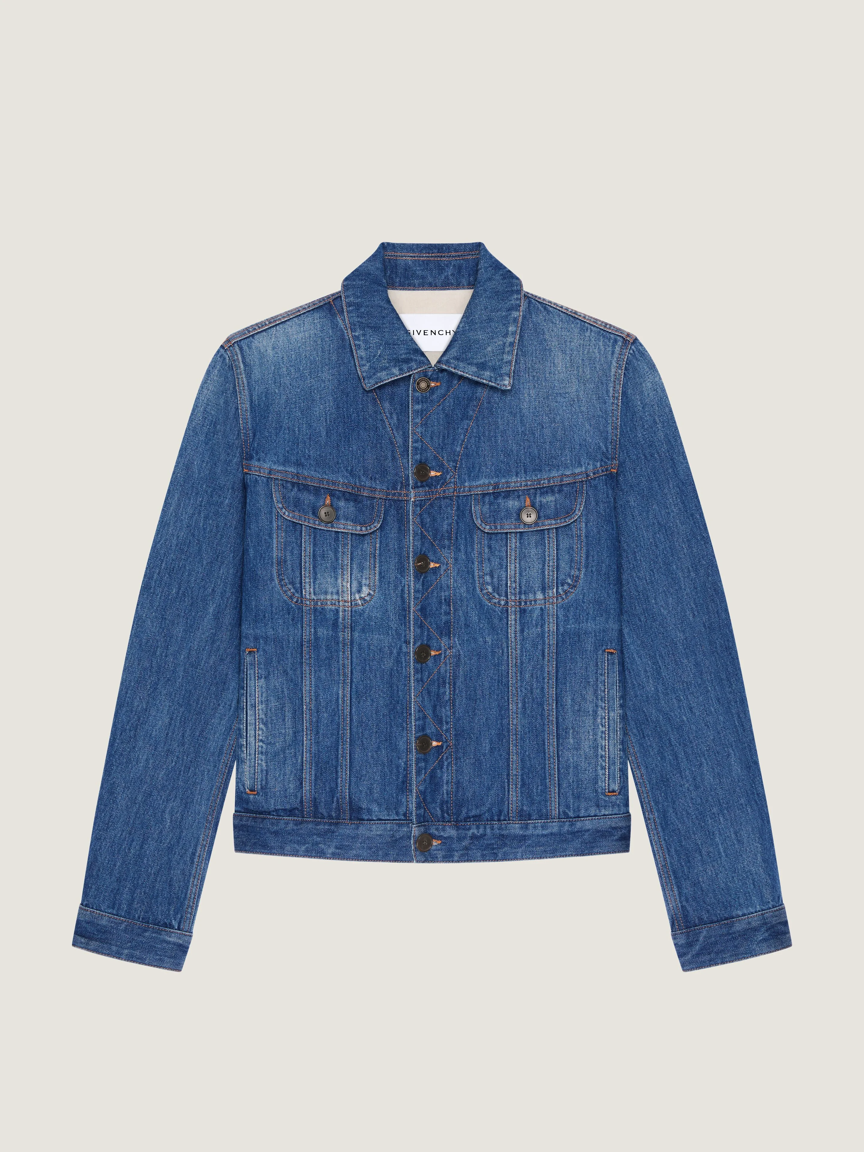 - Jacket in medium blue denim. - Classic collar. - GIVENCHY Paris leather patch on the upper back. - Button closure. - Buttoned cuffs. - GIVENCHY engraved silvery button on top. - Horn buttons. - Two flap chest pockets. - Model measures 6.1 Feet and wears a size M.