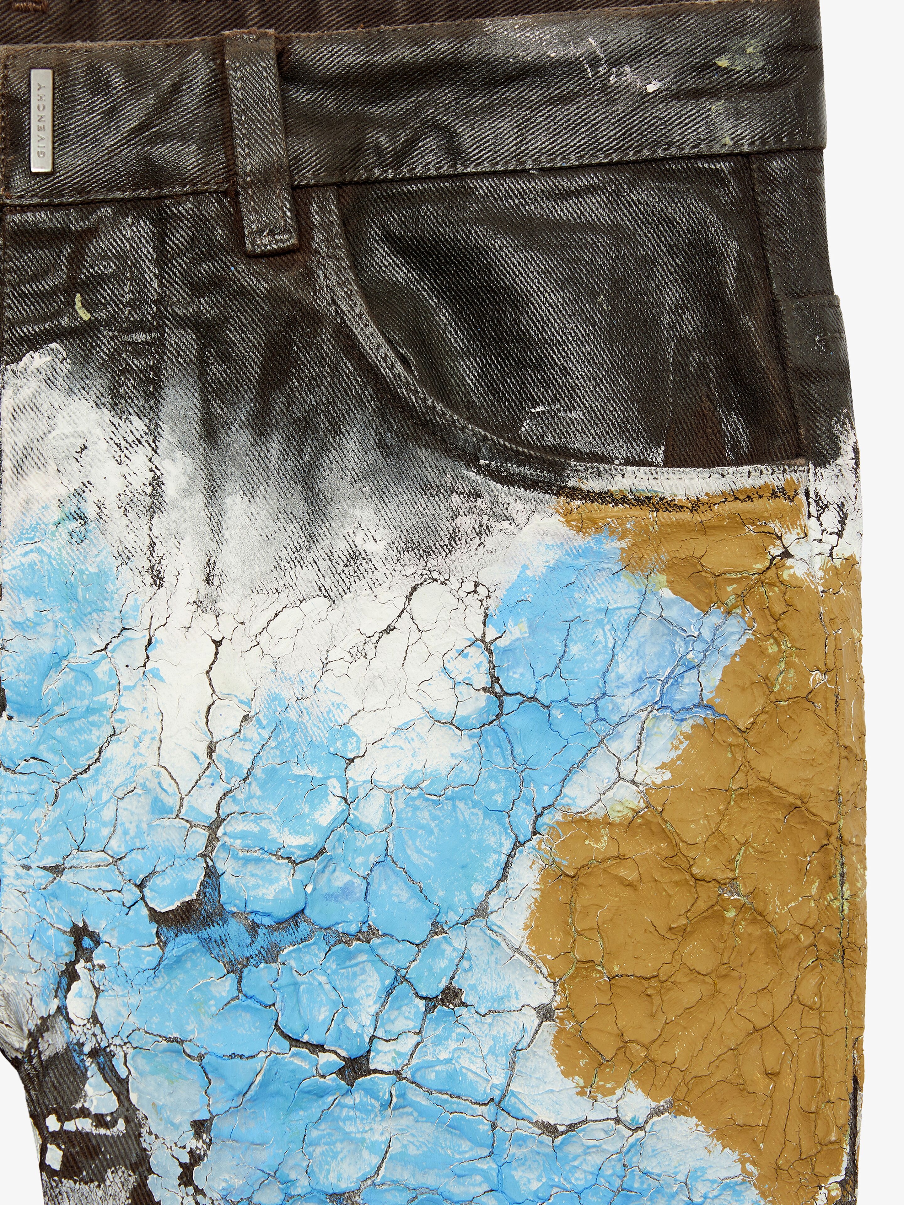 - Jeans in coated denim. - Color: black. - Cracked-effect white, blue and ocher paint on the legs. - Metal GIVENCHY barrette closure. - Two side pockets. - Two patch pockets and one hidden pocket with 4G rivets on the back. - Straight-cut.