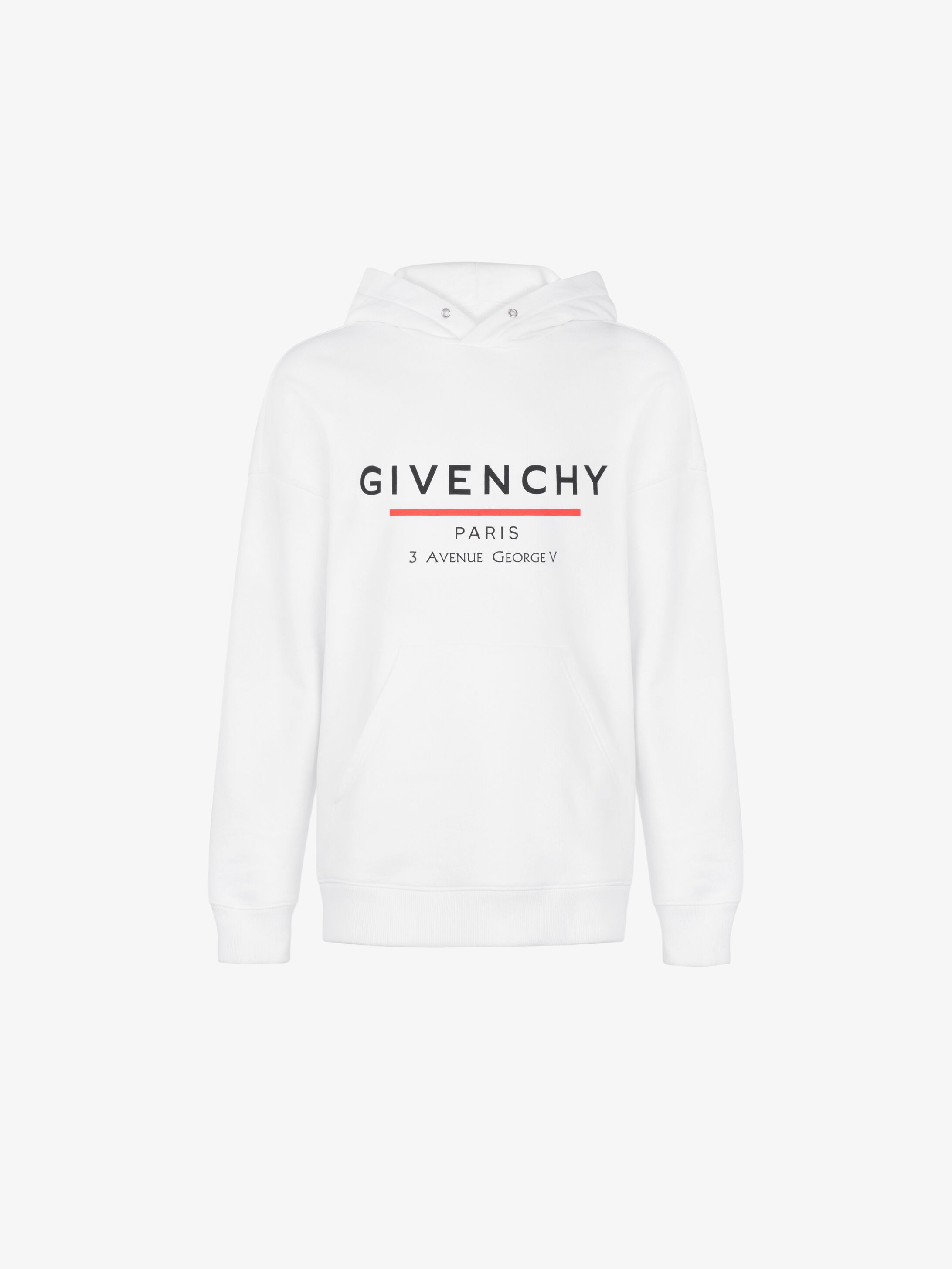 Hooded white felpa sweatshirt with black and red GIVENCHY Label print on the chest. One large pocket on the front. Product code: BMJ05430AF-100 Composition: 100% cotton. Other Country of origin: Portugal.